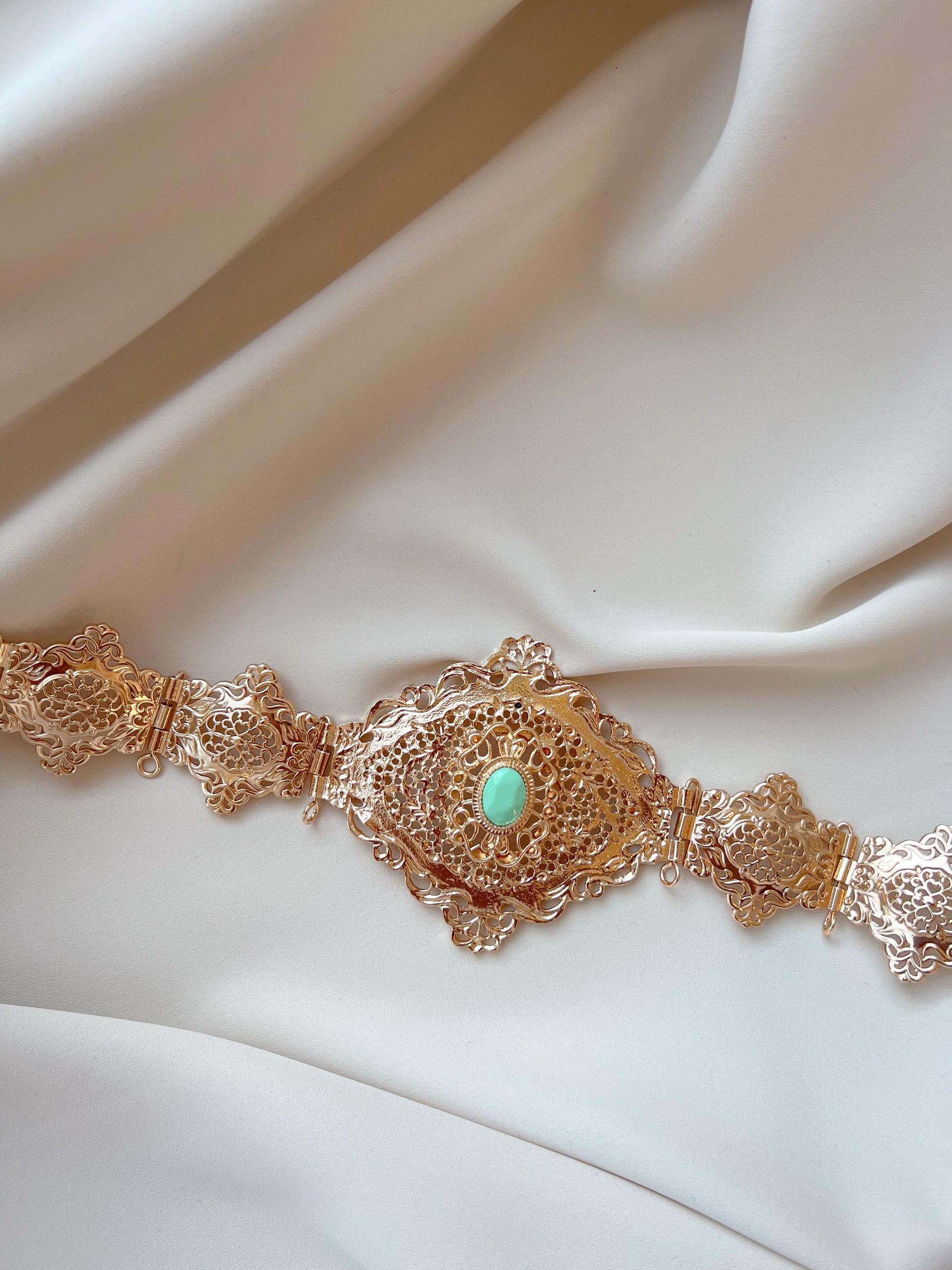 Verstelbare Marokkaanse riem in goud met een zeegroene steen.
