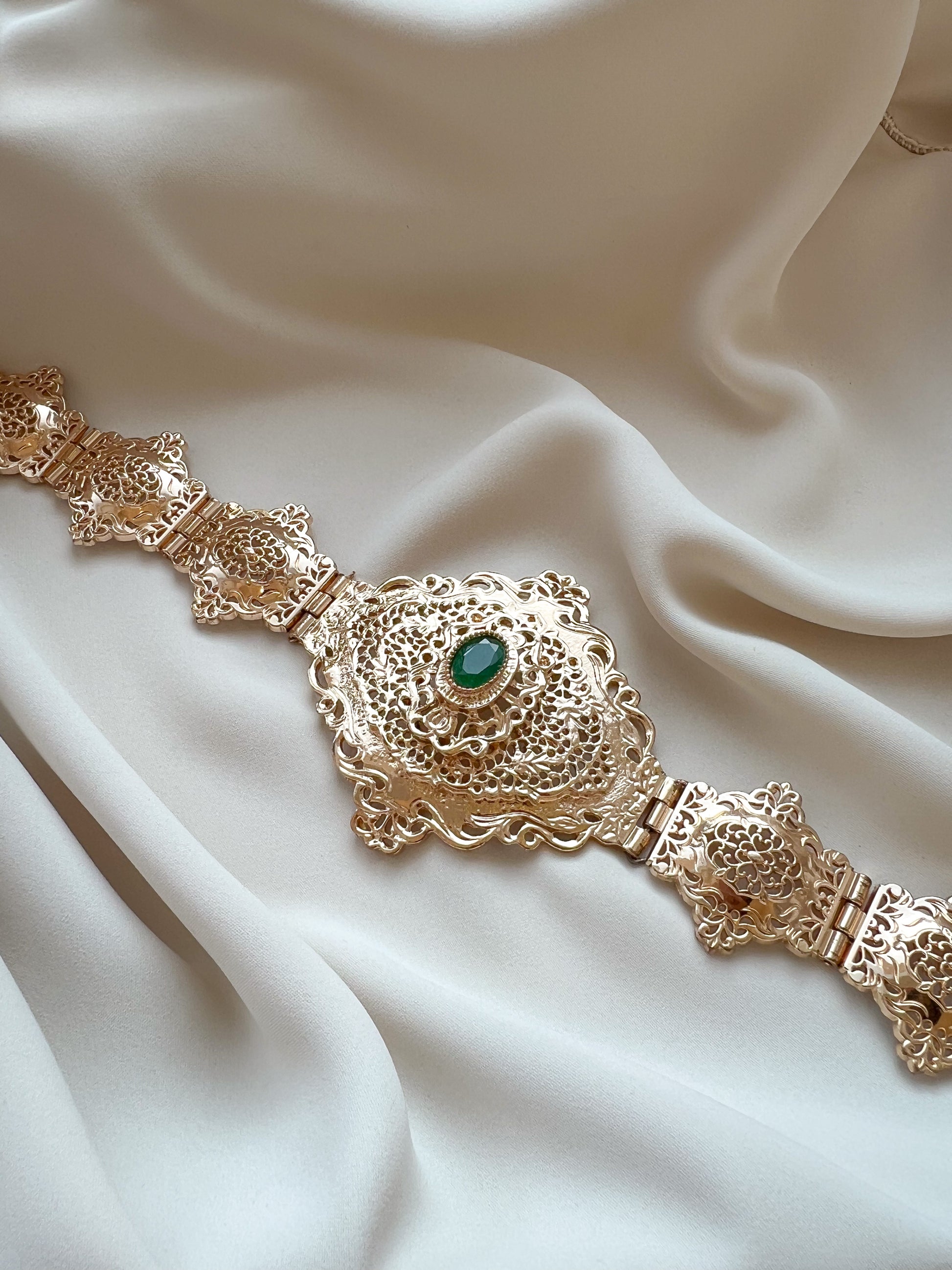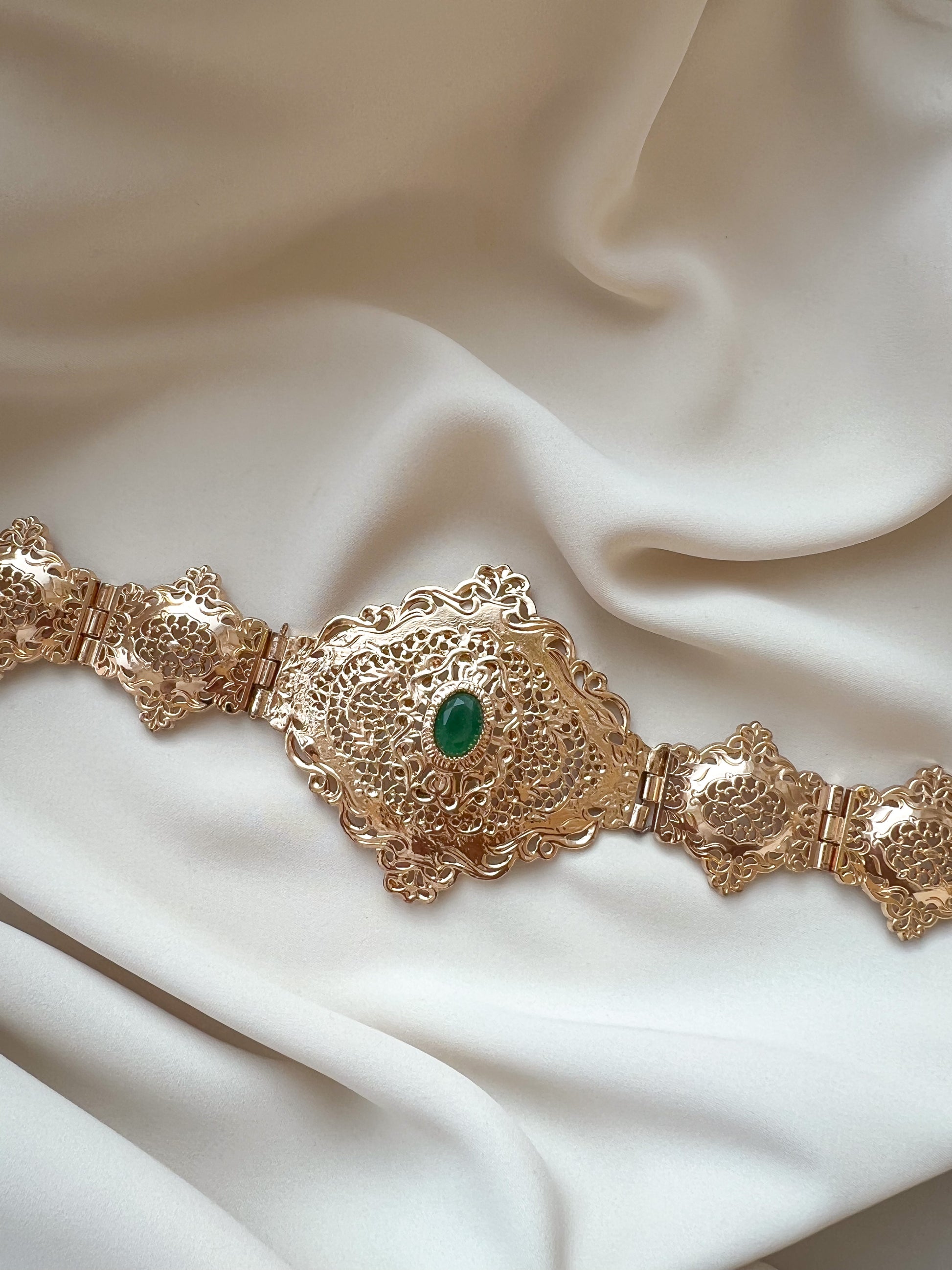 Verstelbare Marokkaanse riem in goud met een donker groene steen.