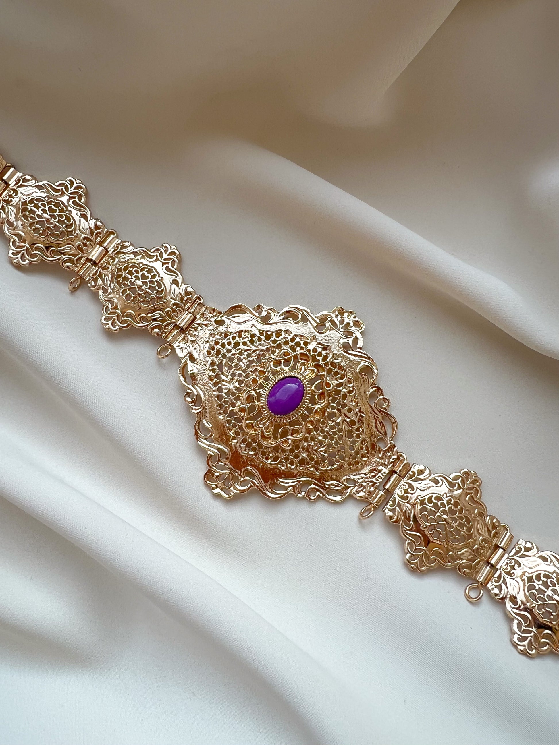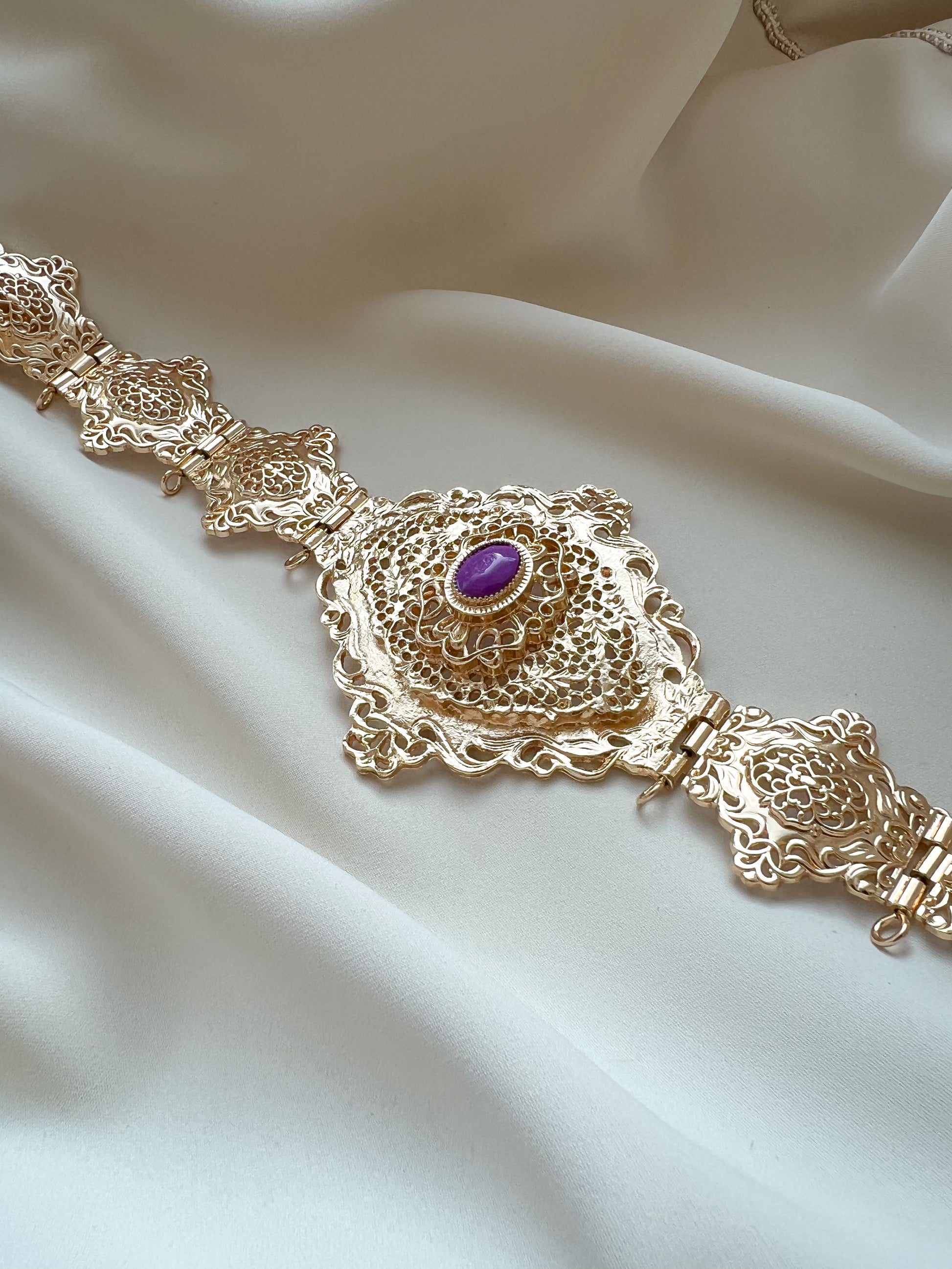 Verstelbare Marokkaanse riem in goud met een paarse steen.